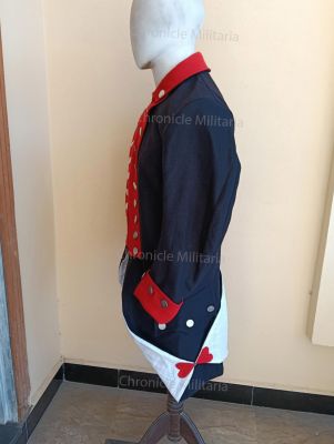 This is American continental Army Regimental coat made of navy blue wool and red wool facing,collar and cuffs. Lining is linen like cotton. Buttons are made of pewter.