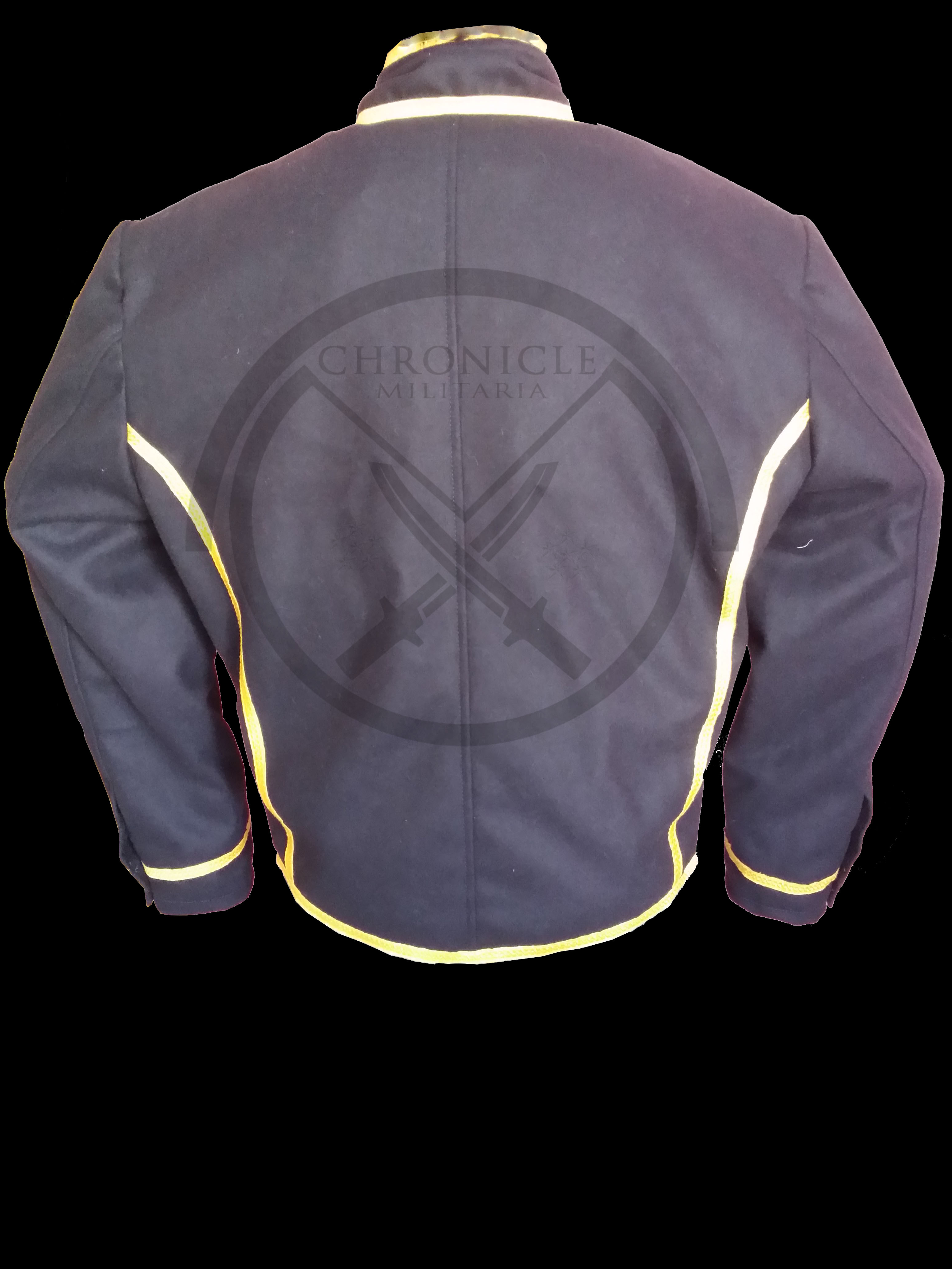 This Jacket is made from Navy blue wool.Inside is lined with cotton material and have an inside pocket.The collar trim has double row of tape.
