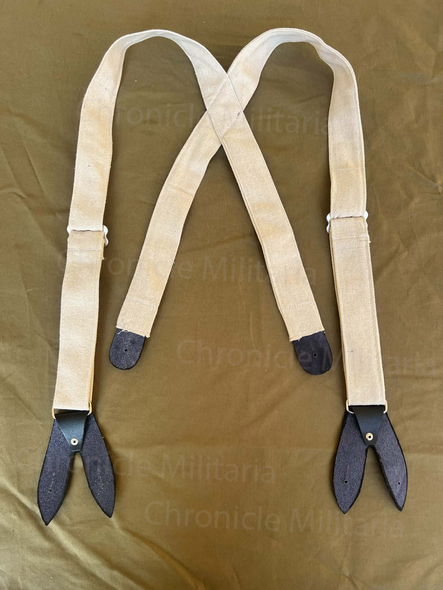 These are canvas suspenders with buckles to adjust them and with leather ends. These are important for holding up your pants.