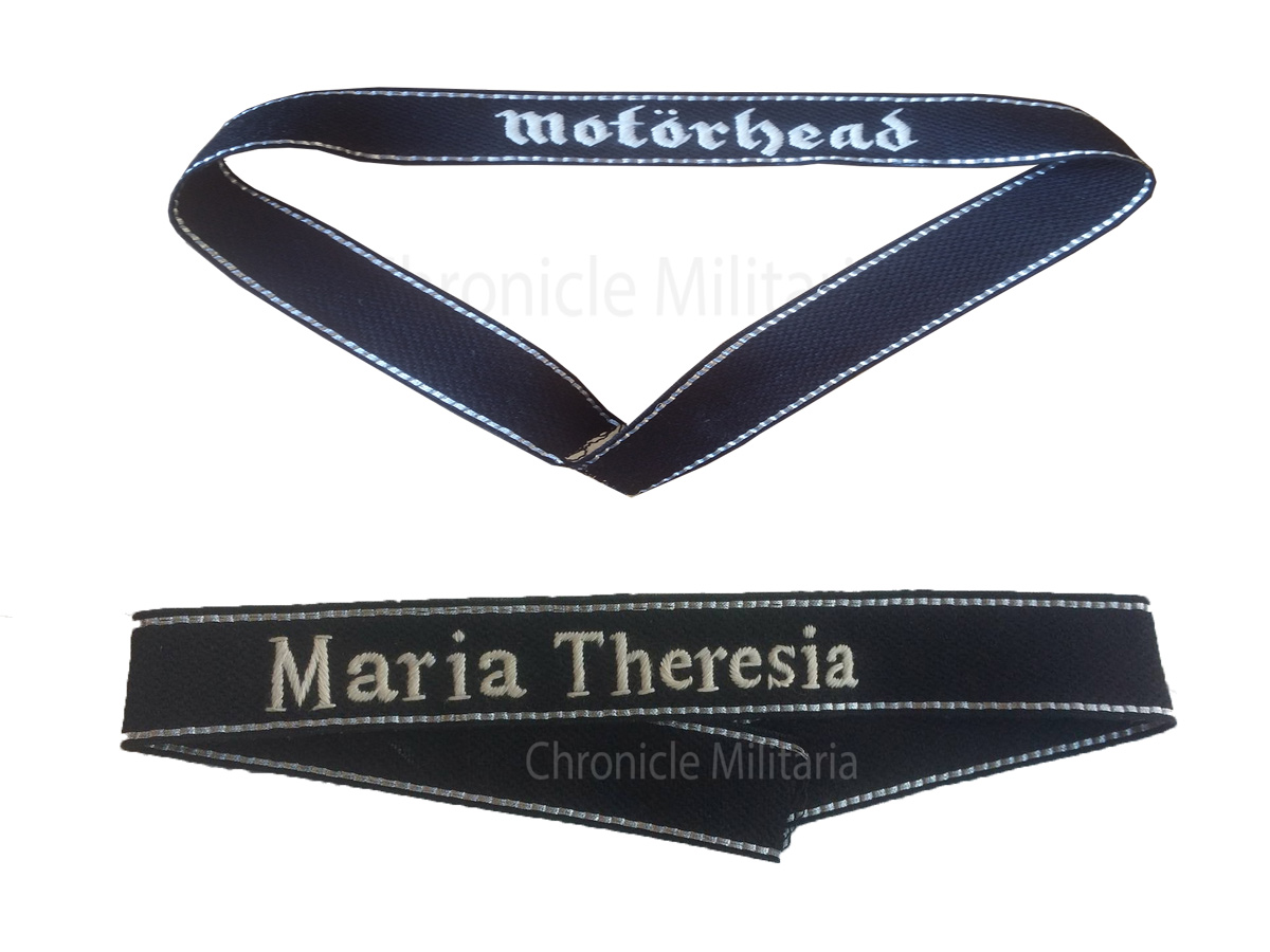 These black cuff titles are embroidered with the "motorhead" and "Maria Theresia"grey thread. They feature a thin silver coloured border close to the upper and lower edges of the band.