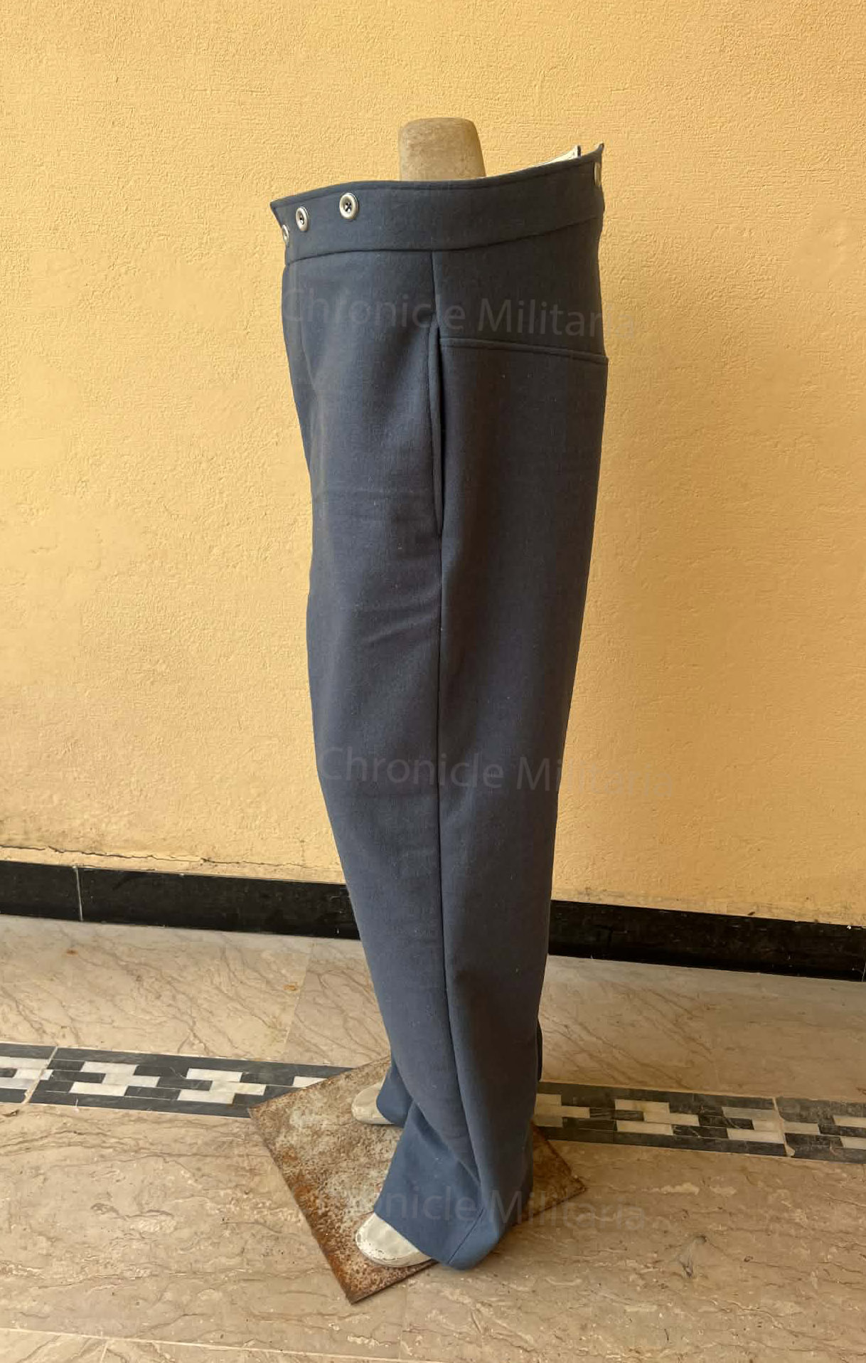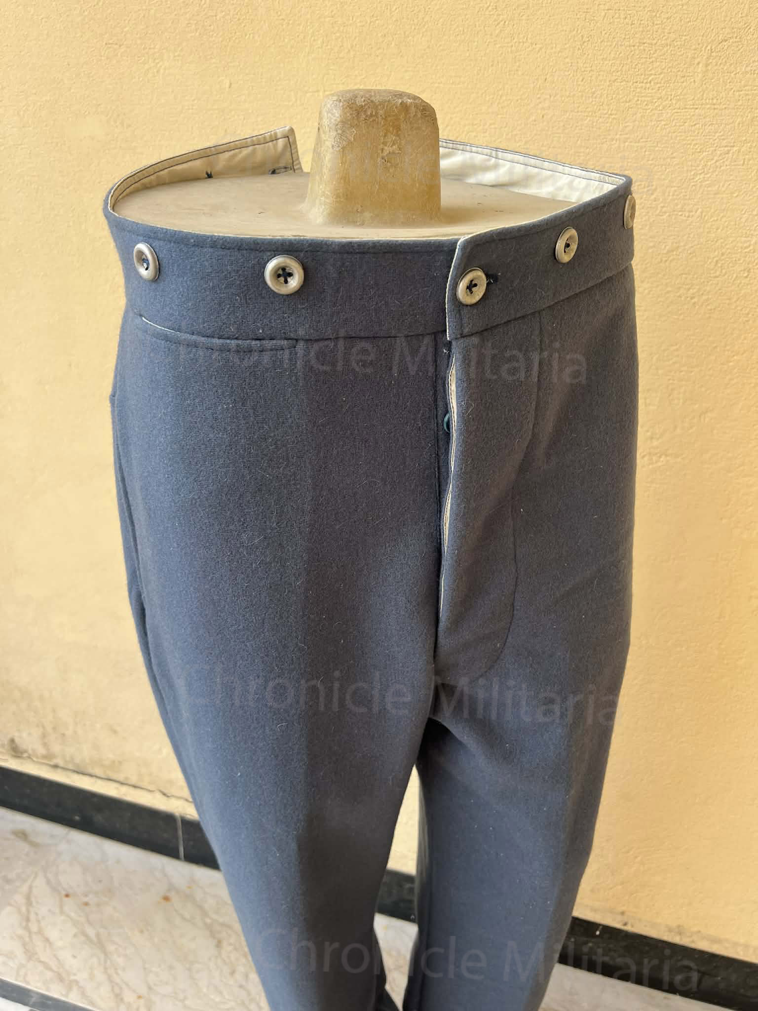 This is US foot trousers made of quality sky blue wool with cotton facings and pockets. The button fly is lined with cotton to make it flexible for buttoning. The V on the waist band has button holes for a tie to allow for waist adjustment. The trousers has a watch pocket and two side pockets. Metal button are used for suspenders and at the fly. Inseam is unhemmed to adjust it according to your inseams.