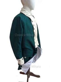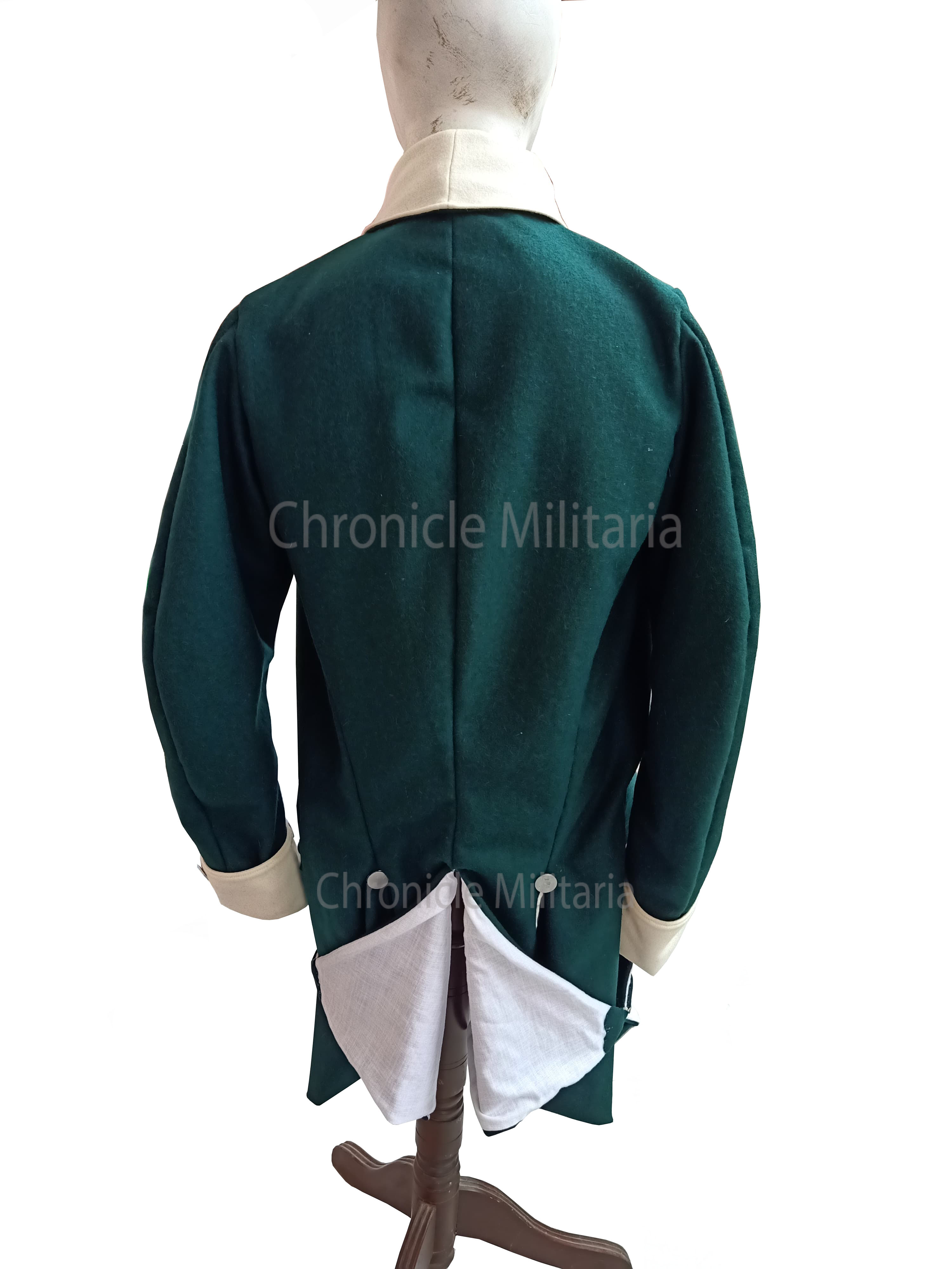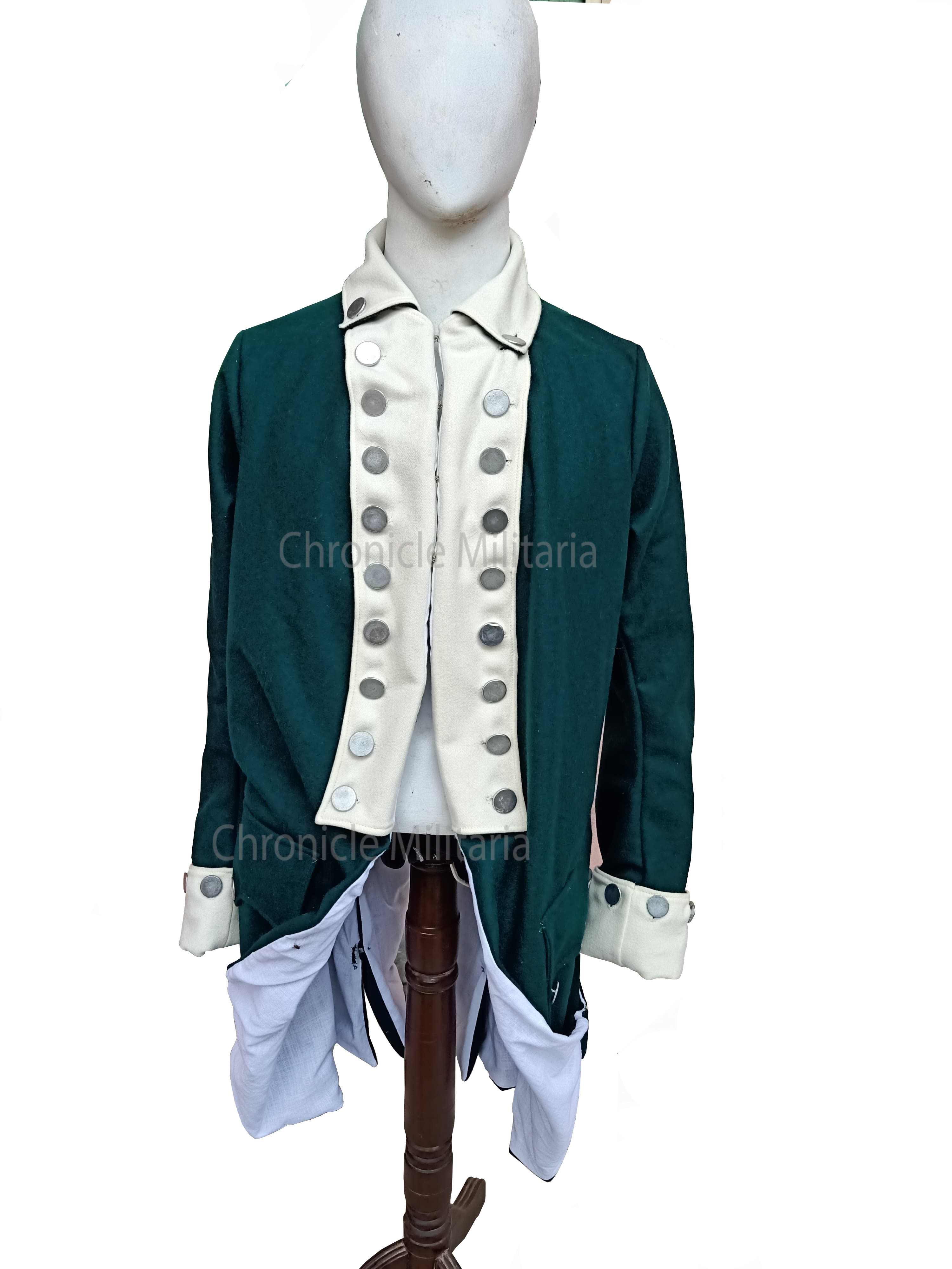 This is Revolutionary war American marine coat made of dark green wool with off white wool facing, cotton lining and pewter buttons.