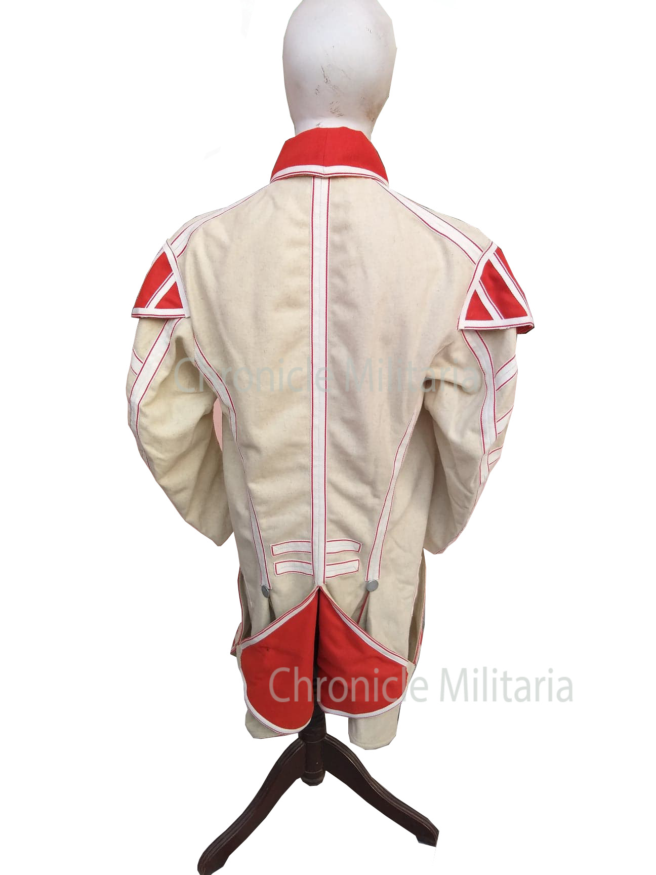 This is revolutionary war musician;s wool coat made of off white wool with red wool facing and with proper lacing and cotton lining .
