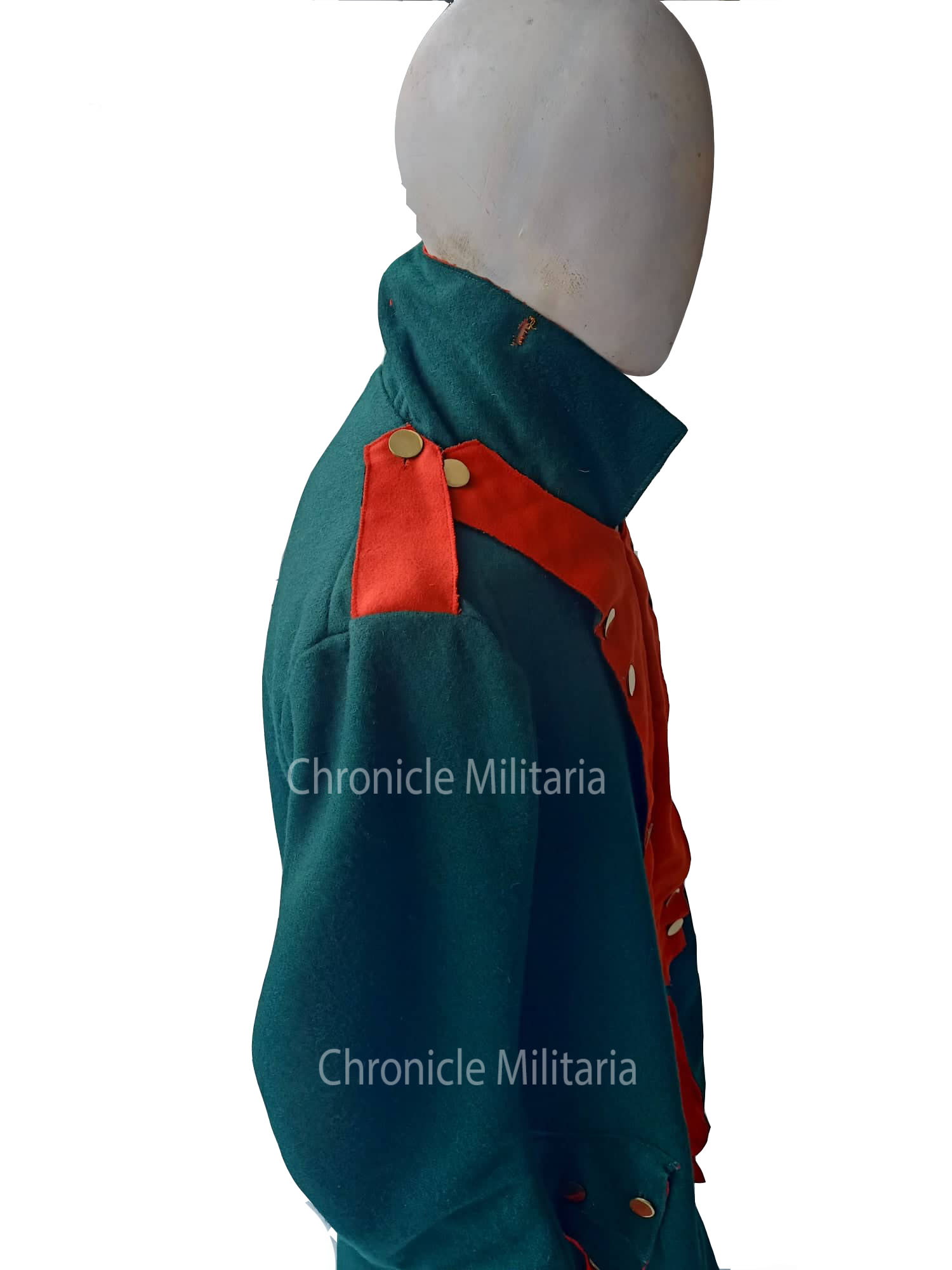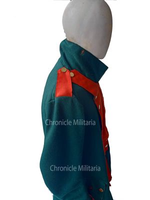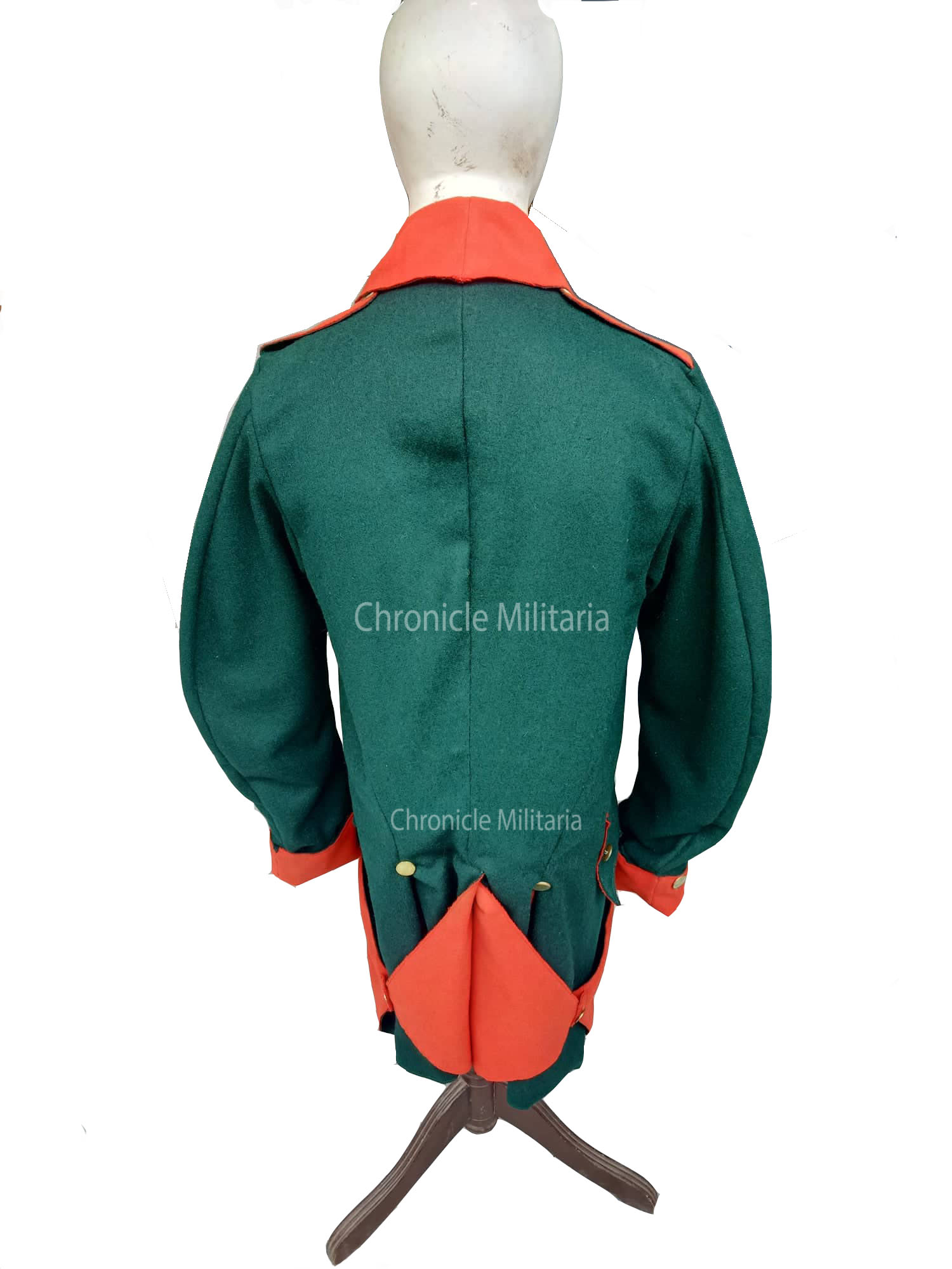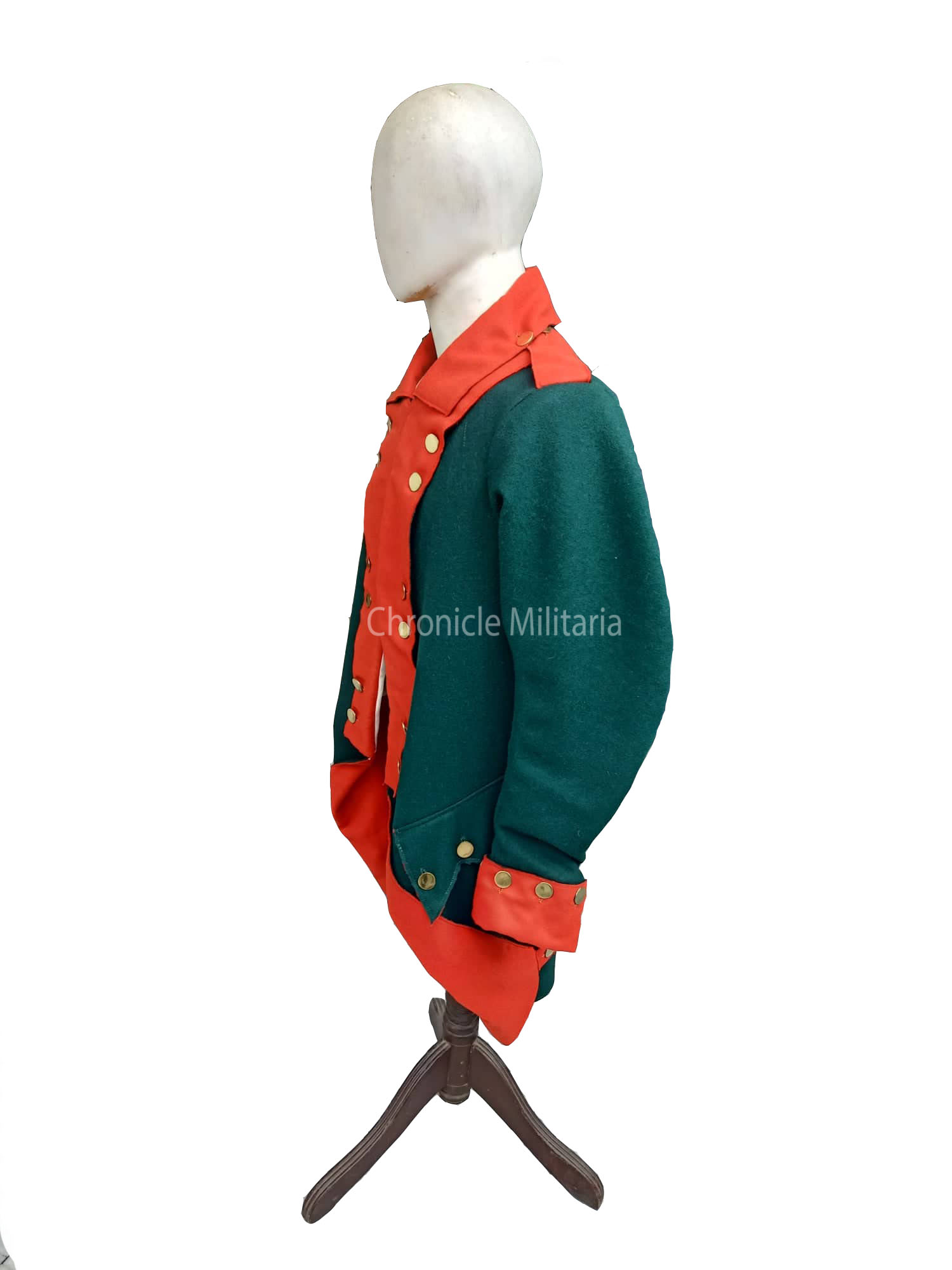 This is rev war era German jaeger regimental coat made of green and red wool and cotton lining. Plain brass buttons are used on it.