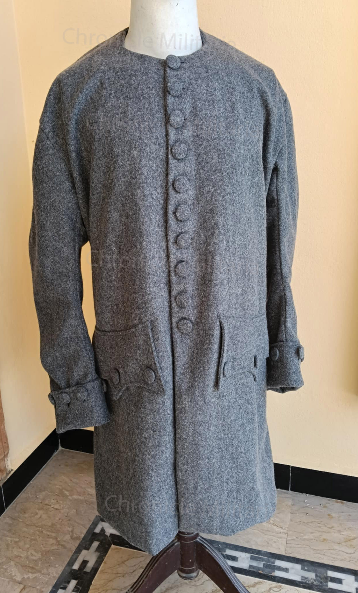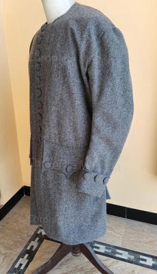 It is Revolutionary war grey civilian coat made of grey wool with grey linen lining and cloth covered butoons.