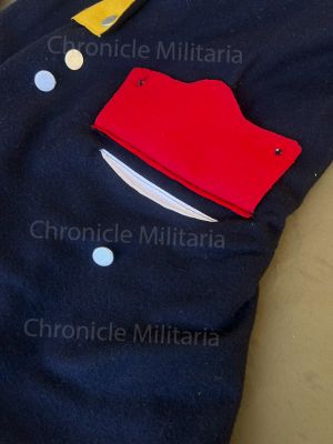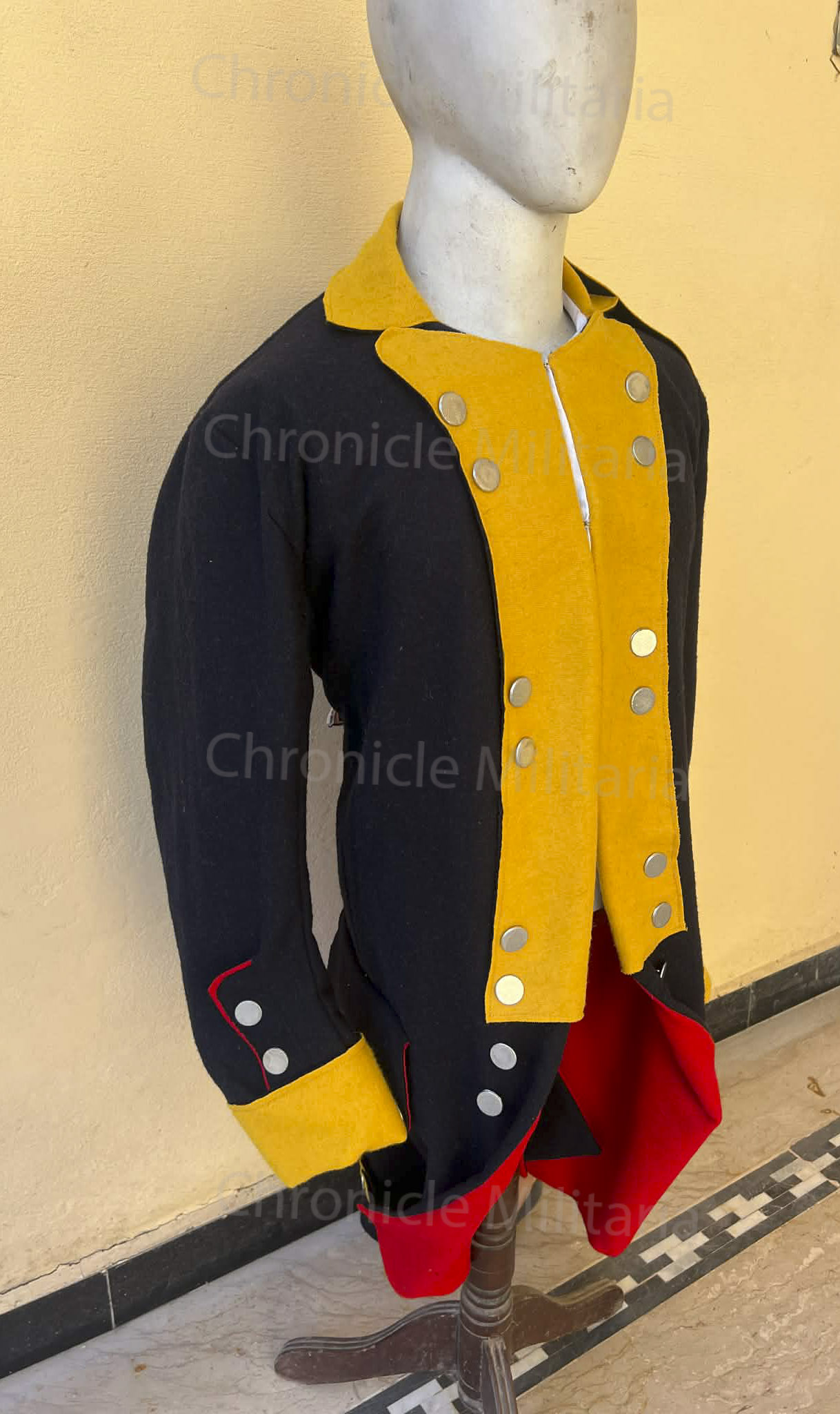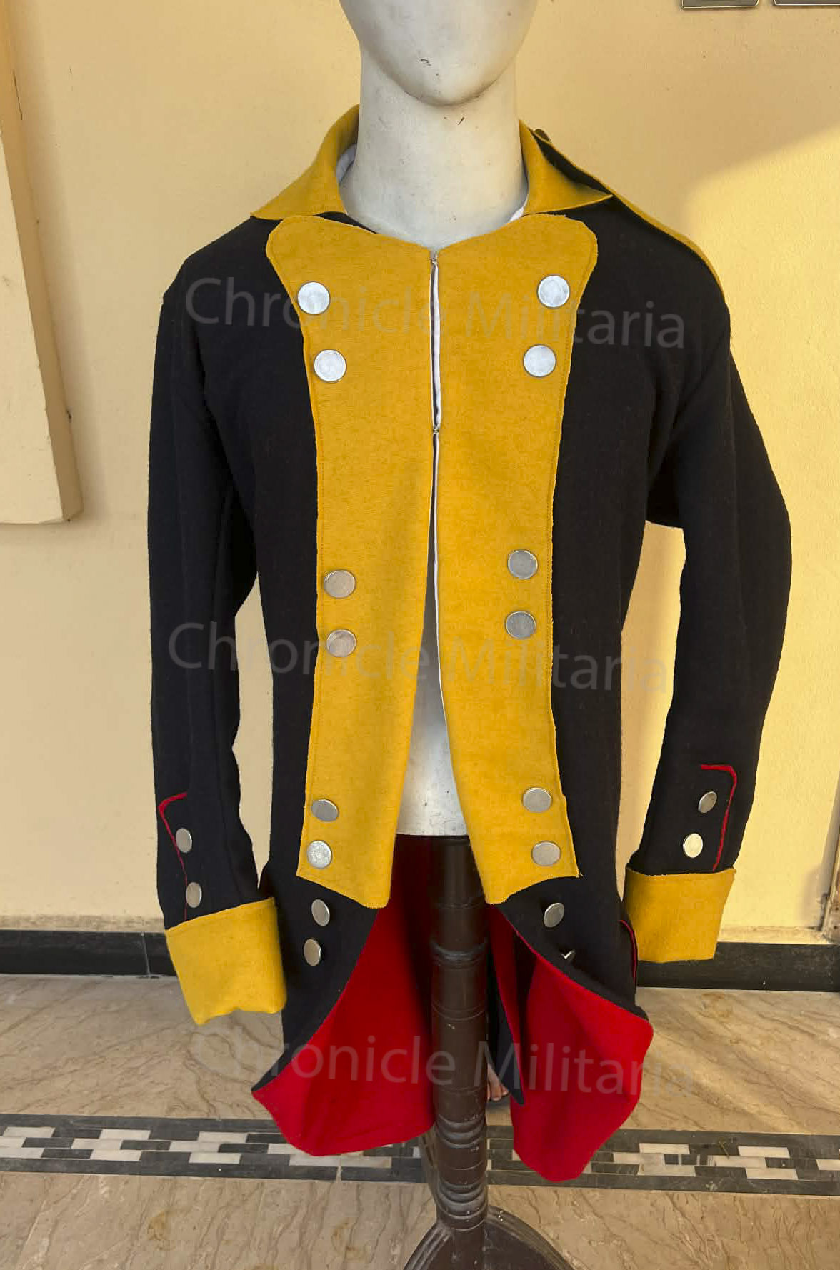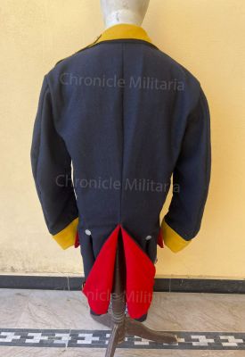 This is Revolutionary war German or Hessian regimental coat made of good quality navy blue wool with yellow facing, cuffs and collar. Inside tails lining is red wool and upper body liner is white linen. pewter buttons are used in its construction.